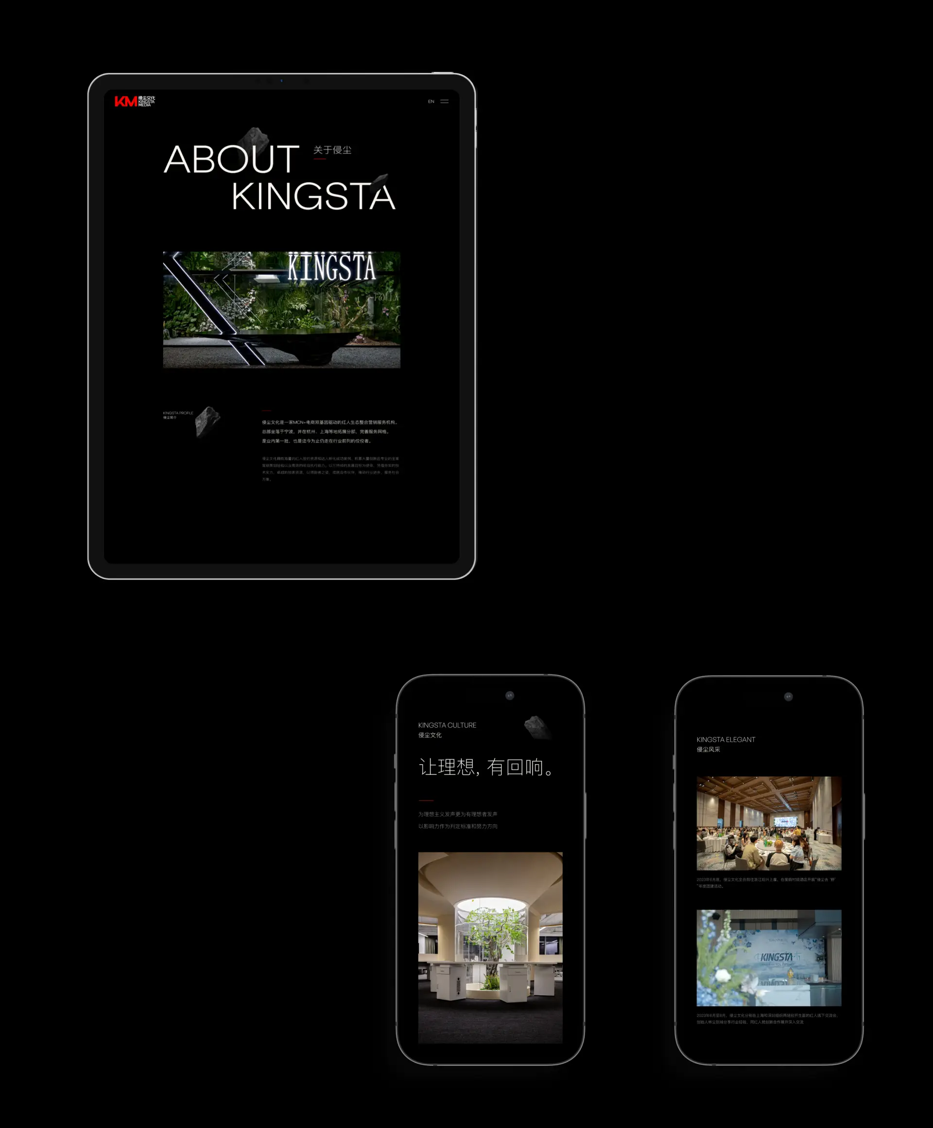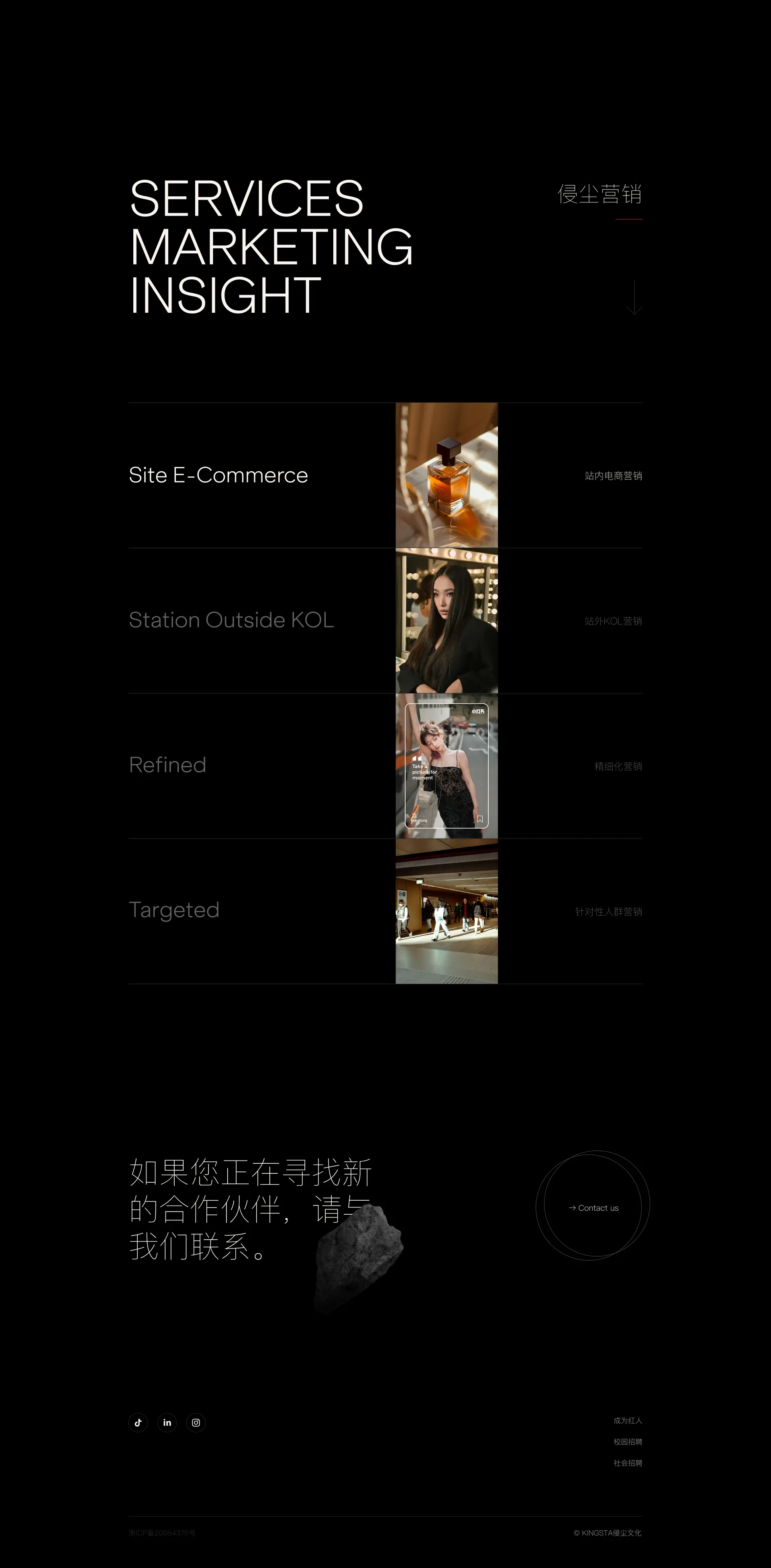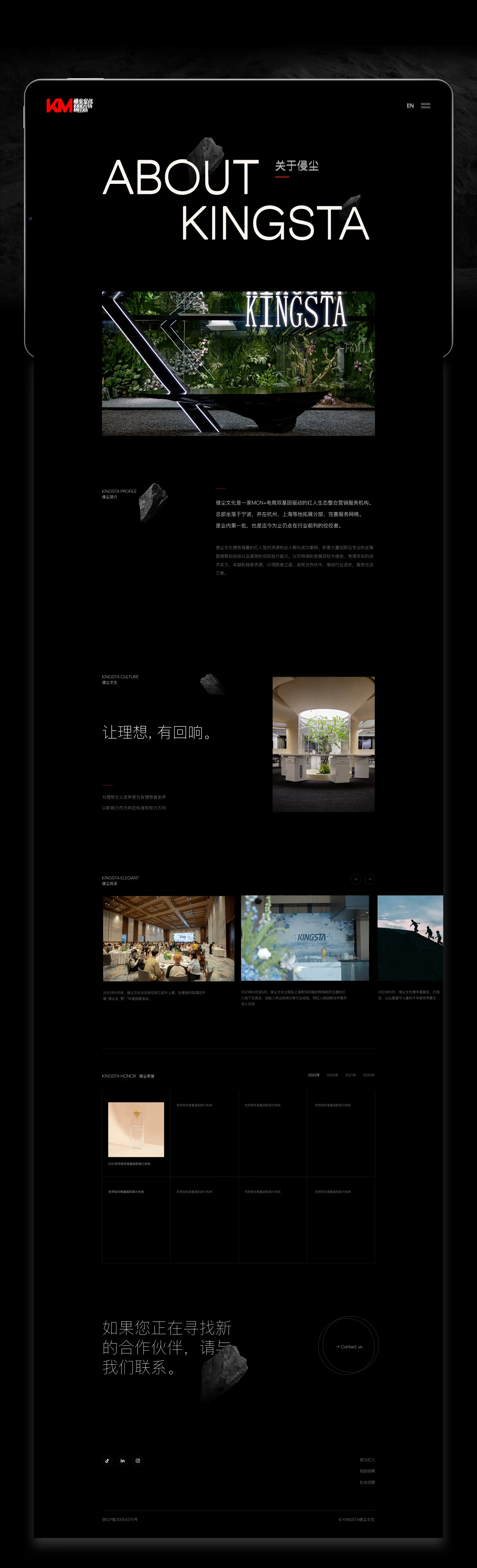 KingSta 侵尘 行业国内顶级MCN机构 项目简介侵尘文化是一家MCN+电商双基因驱动的红人生态整合营销服务机构。总部坐落于宁波,并在杭州、上海等地拓展分部,完善服务网格。是业内第一批,也是迄今为止仍走在行业前列的佼佼者。侵尘文化拥有海量的红人签约资源和达人孵化成功案例、积累大量创新且专业的全案营销策划经验以及高效的项目执行能力。以可持续的发展目标为使命,凭借夯实的技术实力,卓越的独家资源,以领跑者之姿,成就合作伙伴,推动行业进步,服务社会万象。 服务网站设计开发 网址访问 https://www.kingsta.com/